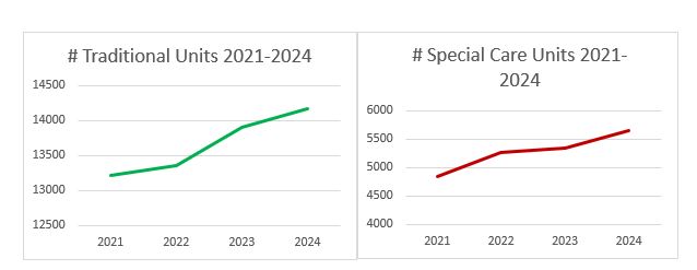 Similar to last year, more units were added that were special care units than traditional units in 2024. Prior to last year, the number of new traditional units added were higher than the number of special care units, which may indicate a trend in the preference of developing special care units over traditional units. However, the total number of special care units continues to only make up about a third of all assisted living units available in the state.