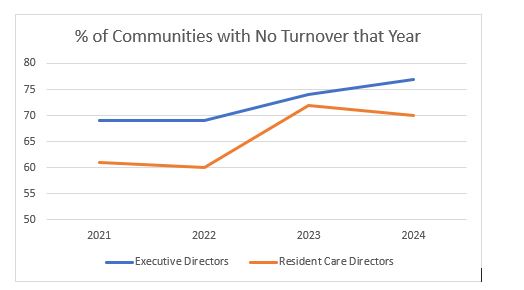 Leadership turnover continues to improve in the assisted living sector, especially in the role of the Executive Director. In 2024, 77% of communities reported no turnover in the Executive Director position, compared to 69% just two years ago (see chart below). Turnover in the role of the Resident Care Director increased slightly in 2024, though the change does not seem significant compared to more dramatic changes on this metric in the years prior.